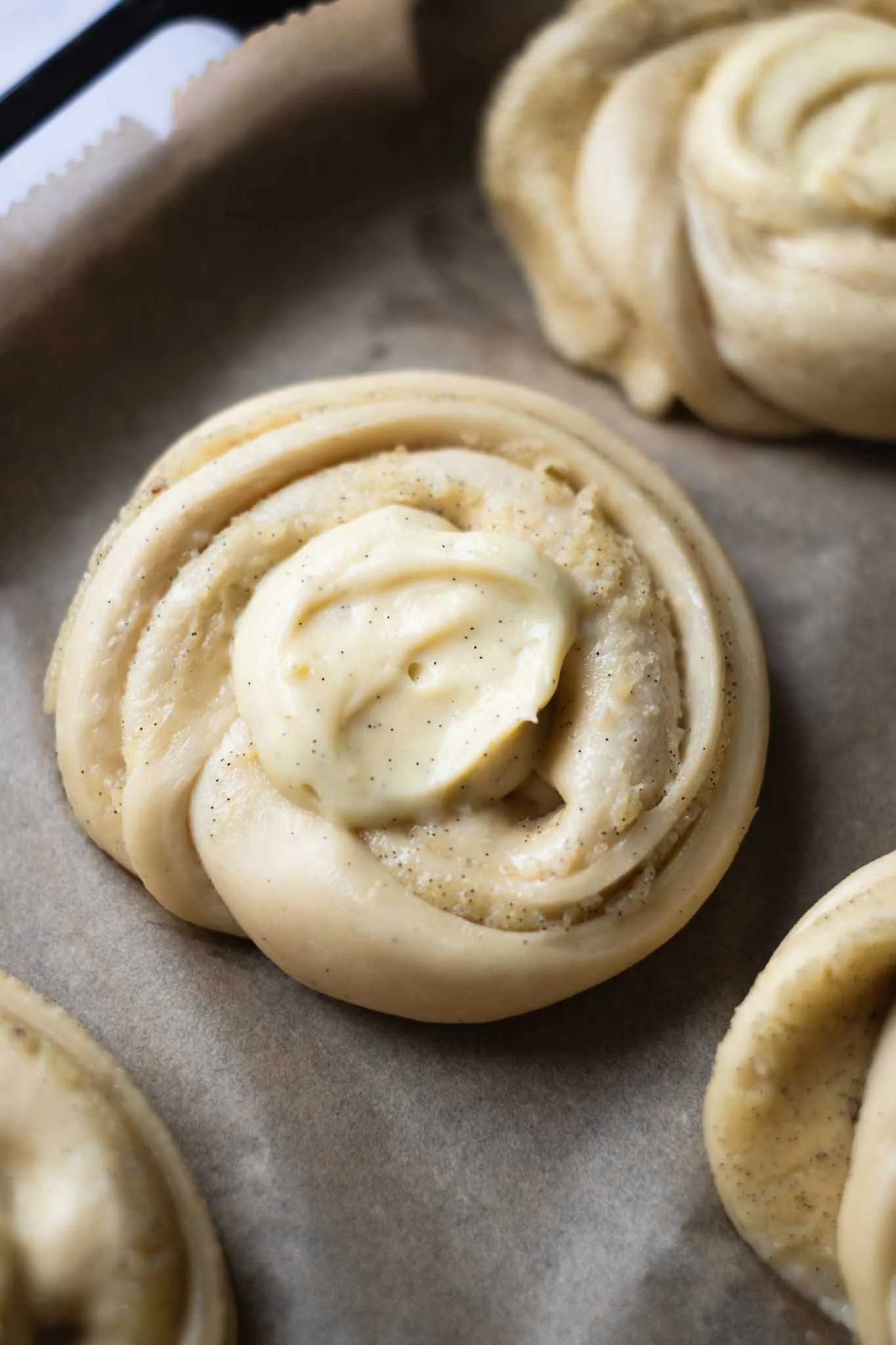For this recipe, I recommend preparing both the dough and the vanilla cream the day before baking. The dough is easy to make and doesn’t require resting at room temperature—it can go straight into the fridge after kneading. However, if you prefer to bake the buns on the same day, make sure the vanilla cream is chilled and ready to go. Prepare the dough and let it rise at room temperature for about 2 hours, or until it has doubled in size.
